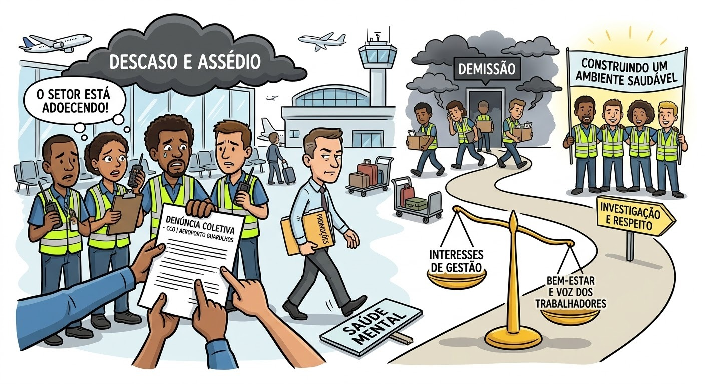 O Sindicato Nacional dos Aeroportuários recebeu uma denúncia anônima envolvendo o Centro de Controle Operacional (CCO), localizado no prédio administrativo do Terminal 2 do Aeroporto Internacional de Guarulhos. O conteúdo, que circulou entre trabalhadores do setor, aponta um cenário preocupante de assédio moral, pressão psicológica e adoecimento no ambiente de trabalho.