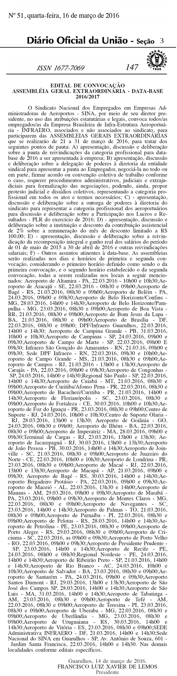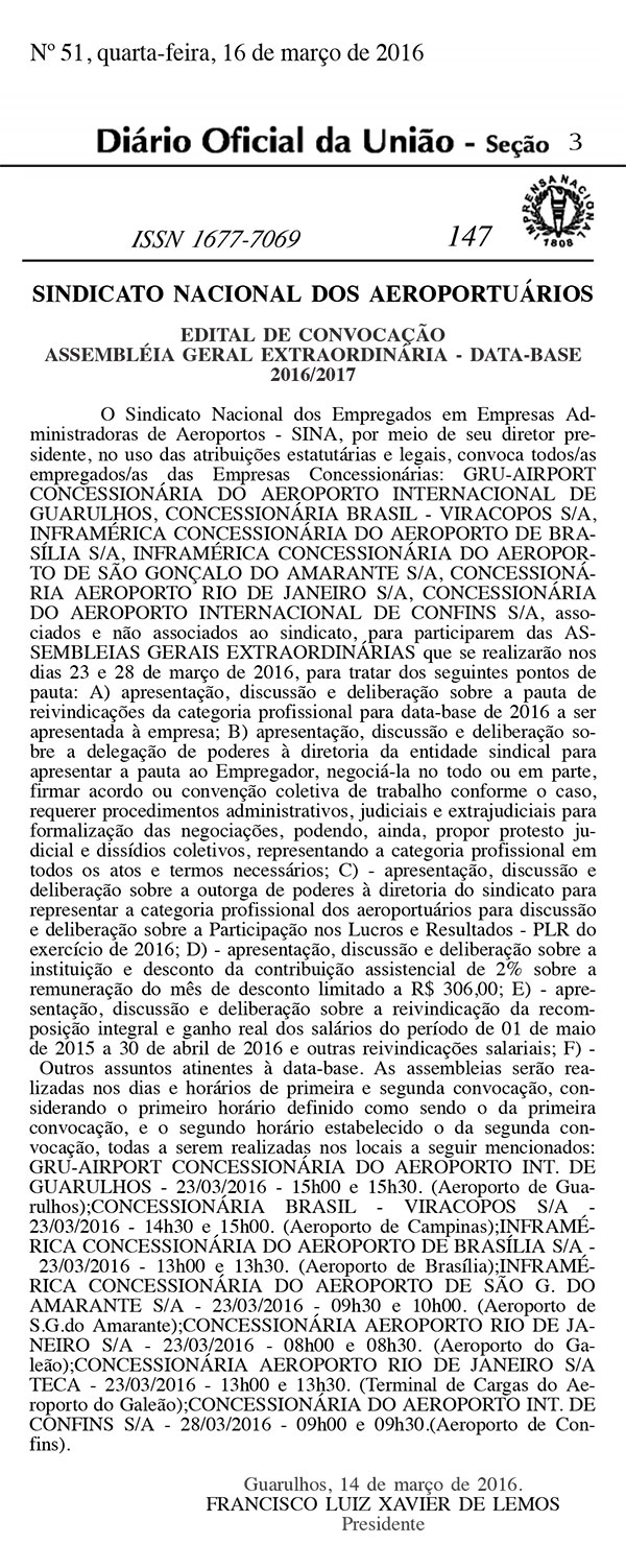 Veja abaixo os editais publicados no Diário Oficial da União, nesta quarta-feira (16/03), com as datas e horários das assembleias em cada aeroporto.