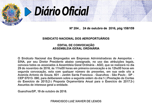 Confira abaixo o edital de convocação para a Assembleia Geral Ordinária de Prestação de Contas, publicado pelo Sina no Diário Oficial da União, nesta segunda-feira (24/10). A Assembleia será realizada em 29 de novembro, às 11 horas, em primeira chamada, e às 12 horas, em segunda chamada, na sede (Av. Antônio de Souza, 601 – Guarulhos), e tem como objetivo a deliberação sobre a prestação de contas do exercício de 2015 e a previsão orçamentária para 2017.